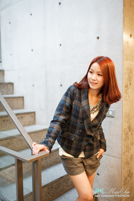 復古格紋西裝外套 + 刺繡領拼接金蔥袖上衣 /米白 + 接絨毛呢短褲(S-M) 灰 + 蛇蚊鍊珠平底鞋