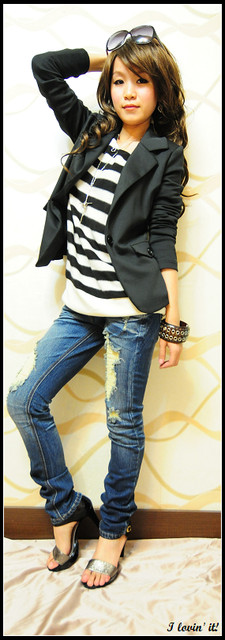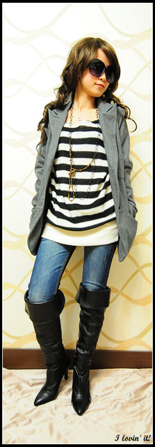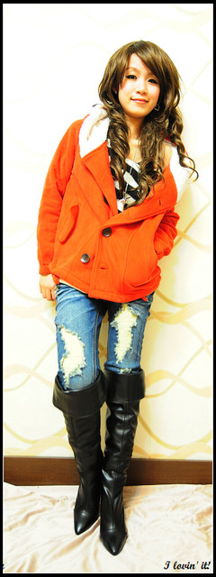 下半身穿了破破牛仔褲+過膝靴