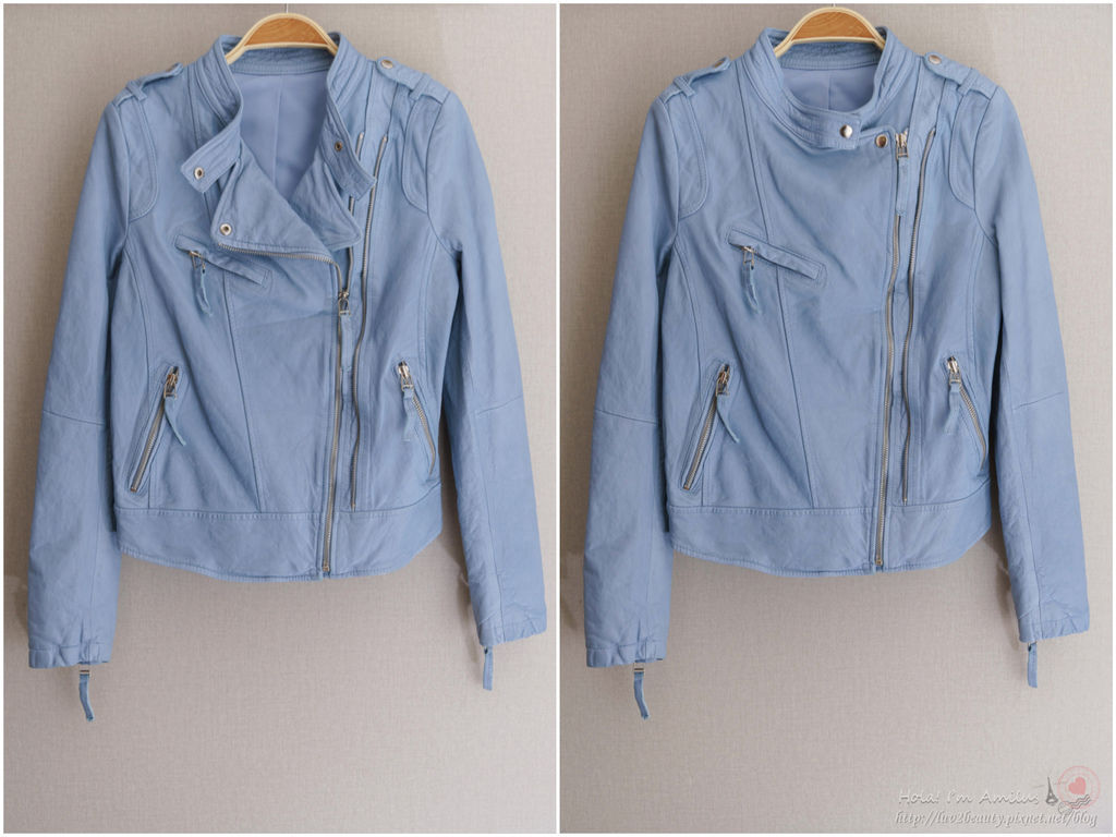 像這樣混入灰色調的嫩藍皮外套非常好搭耐看,超級適合春天